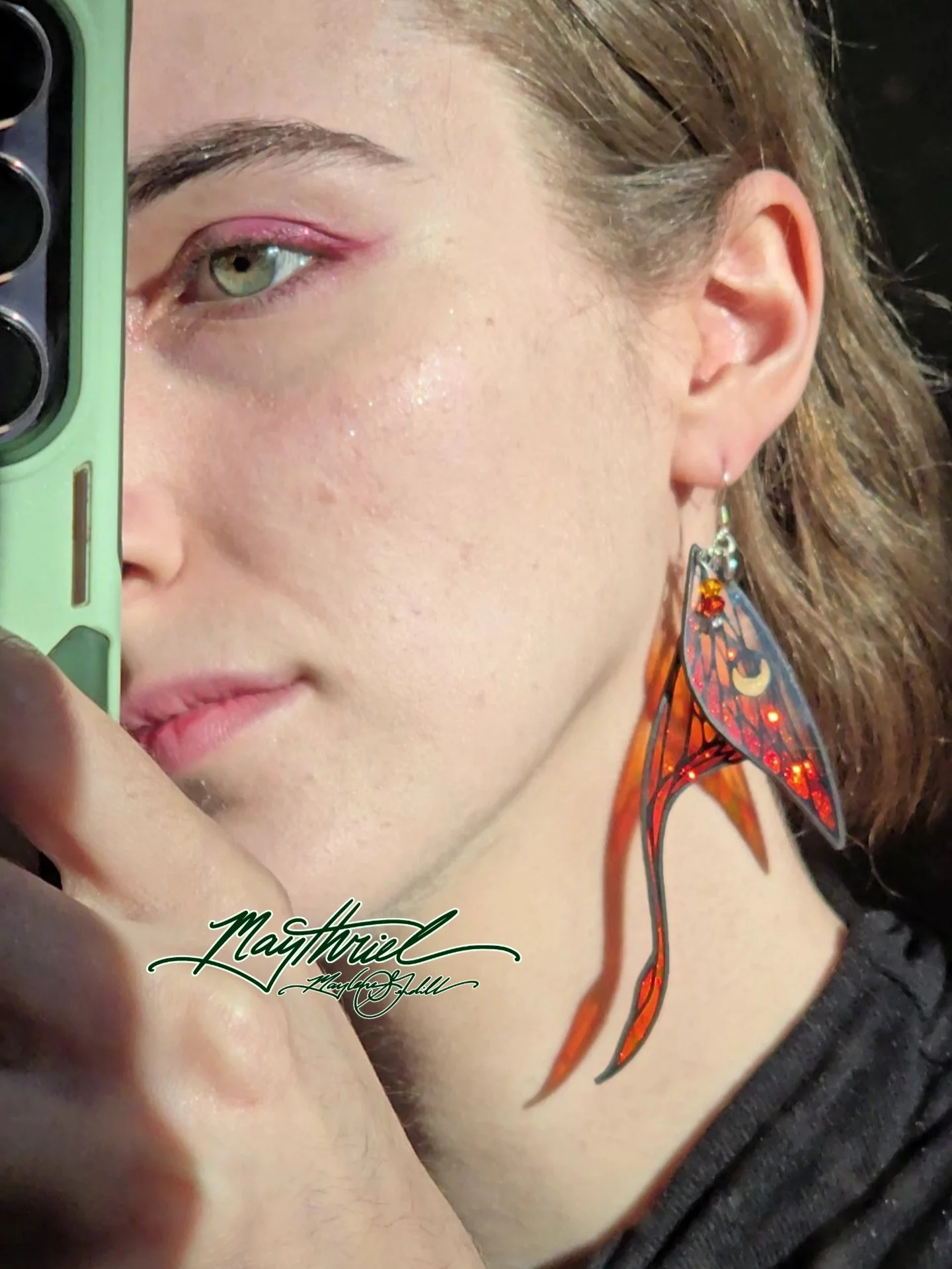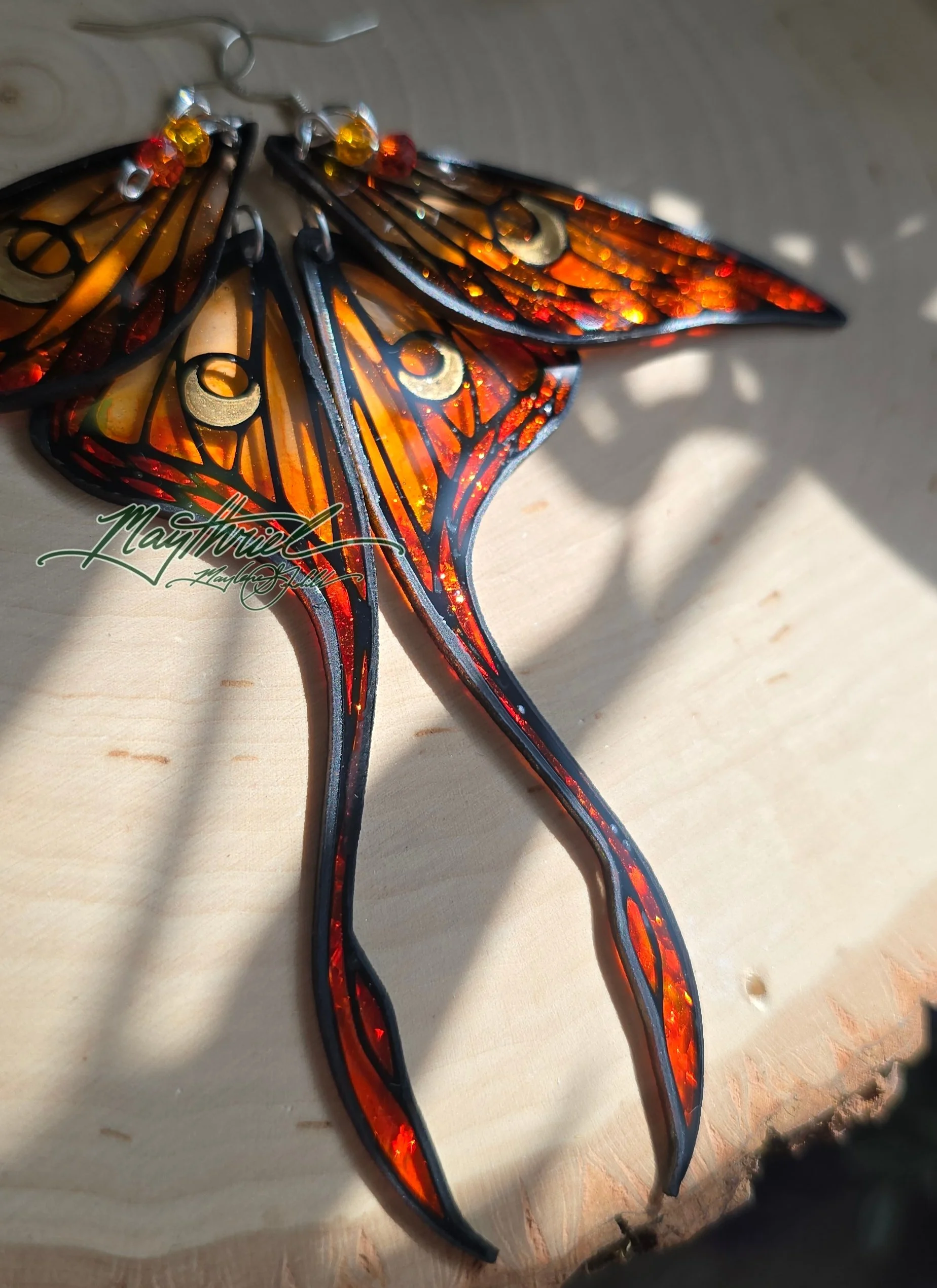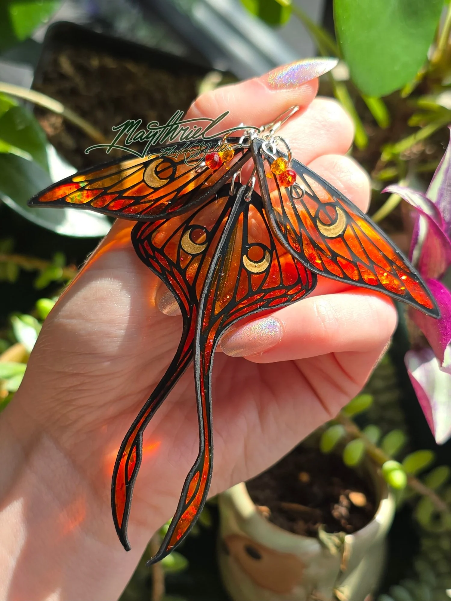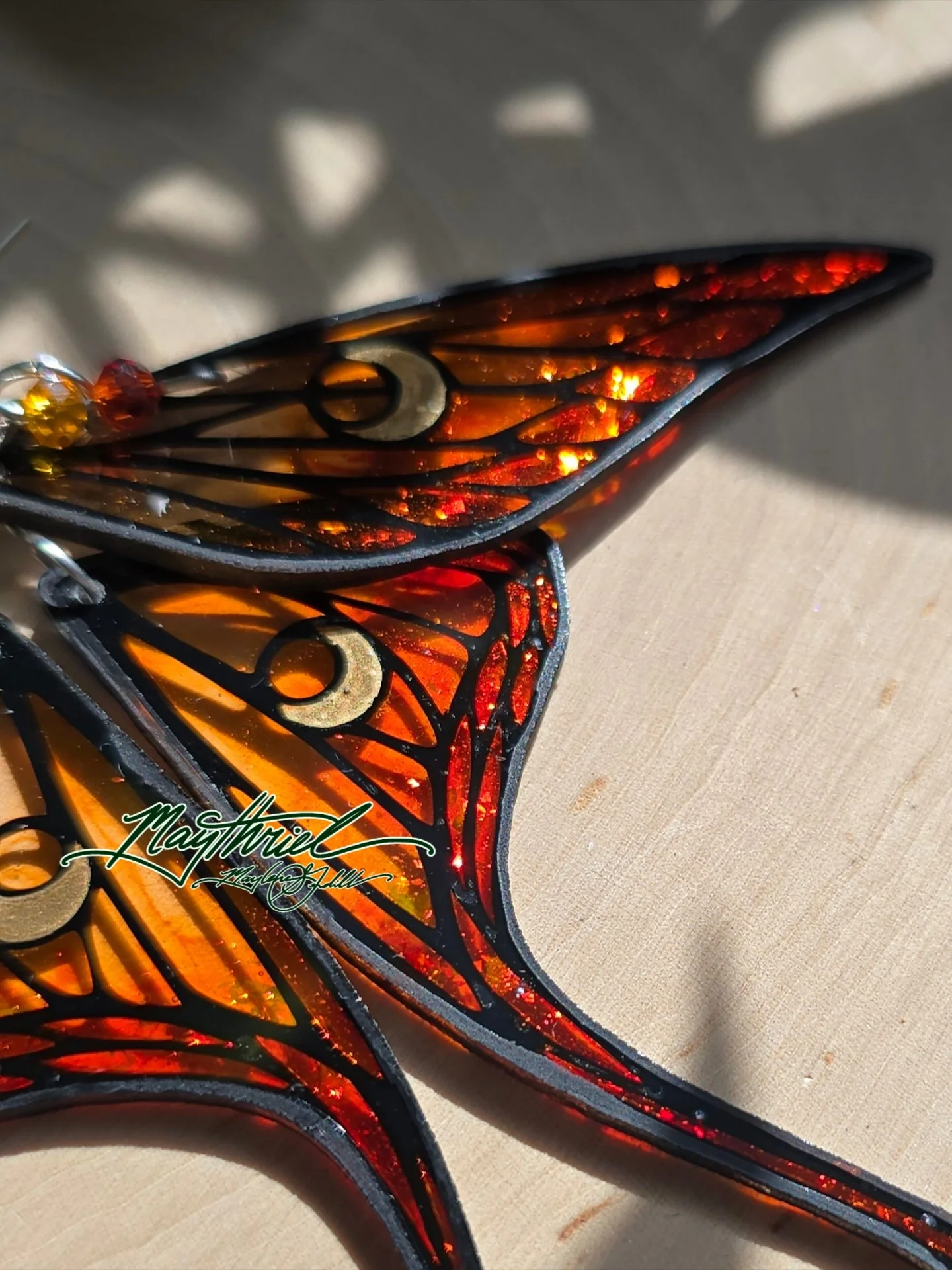 They have a glass like look with a magenta/orange/gold glittery shine. These earrings are incredibly orange and channel that autumn pumpkin spice vibe! They dangle just right to look like a resting Luna moth and they like to flutter in the wind!