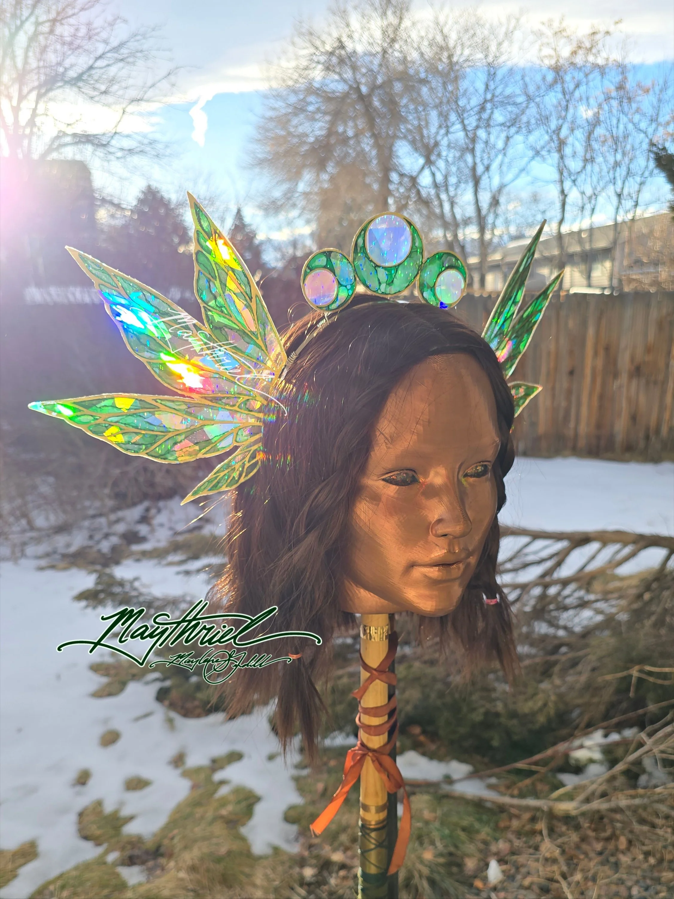These fairy wings are adjustable along the metal headband and also can be pushed backwards and forwards. These fairy crowns are connected with wire, not glue. Please note that since these have wire connectors and wire will work harden and break with excessive bending (but I've only managed to break one in the 3 years I've been making them)